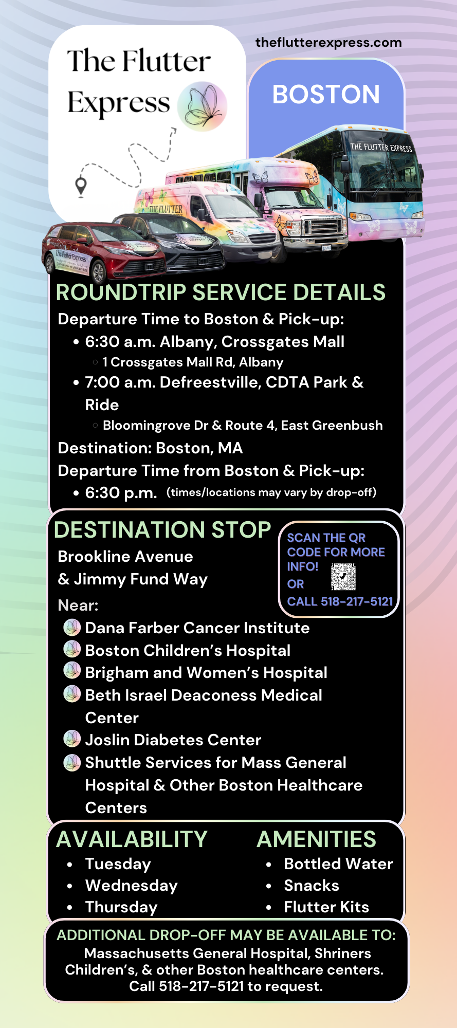 The Flutter Express offers a convenient, round-trip transportation service that departs from Albany and Rensselaer, NY to both Boston and New York City on Tuesdays, Wednesdays, and Thursdays. We provide comfortable, stress-free, and affordable transportation for people of all ages to reach their destinations near top healthcare facilities, along with their family members, companions, and supportive community. To ensure availability, we recommend booking your tickets in advance.