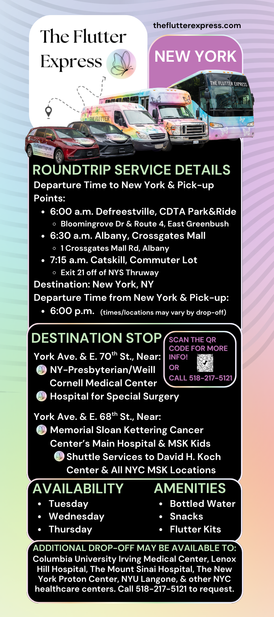 For riders traveling to NewYork-Presbyterian / Columbia University Irving Medical Center, The Mount Sinai Hospital, The New York Proton Center, Lenox Hill Hospital, NYU Langone, or other New York City healthcare centers: Please contact us and indicate your destination in the Special Needs section when booking your ticket. This helps The Flutter Express coordinate, and we may be able to provide direct drop-off near these facilities.