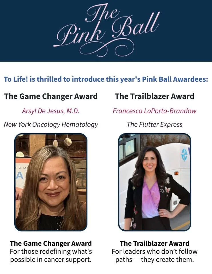 Founder of The Flutter Express, Francesca LoPorto-Brandow, is honored to be recognized at this year’s To Life! Pink Ball.