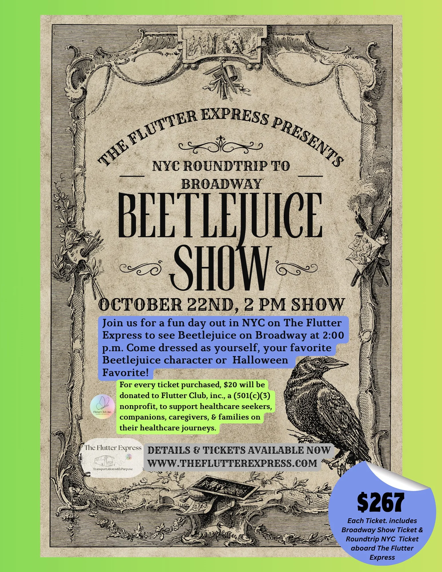 For each ticket purchased, $20 is donated to Flutter Club, inc. to support healthcare seekers, caregivers, and immediate family members on their healthcare journeys.